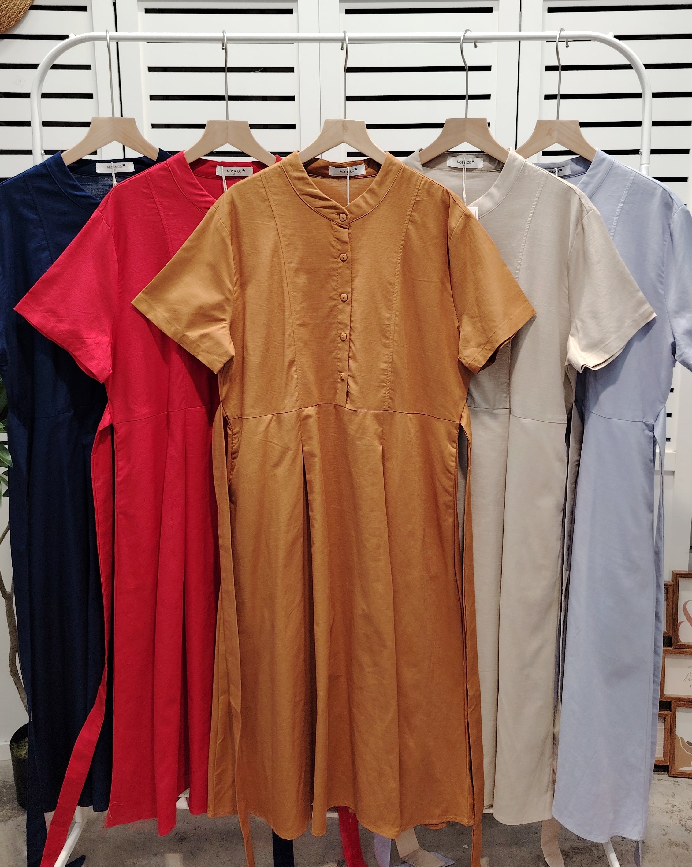 MDS-10249 FREE SIZE New Korean fashion design sense short-sleeved round neck live row buckle hem waist tie thin and temperament jumpsuit women 新款韩式时尚设计感短袖圆领活排扣下摆修腰绑带显瘦又气质连体裙女