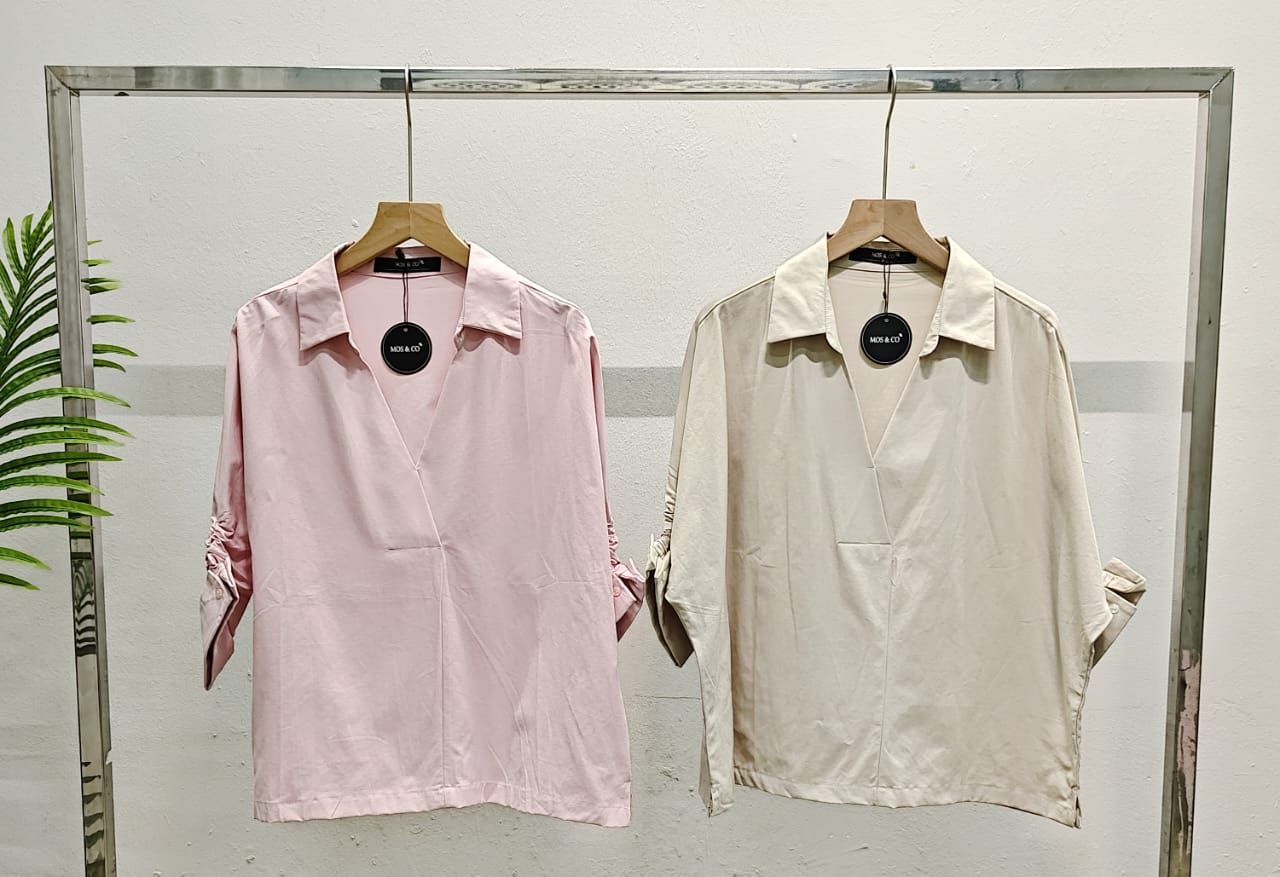 MLB-9063 FREE SIZE New Korean casual V-neck rubber fold fake button beam long-sleeved shirt versatile top women 新款韩式休闲V领橡胶反折假钮扣束手中长袖衬衫百搭上衣女