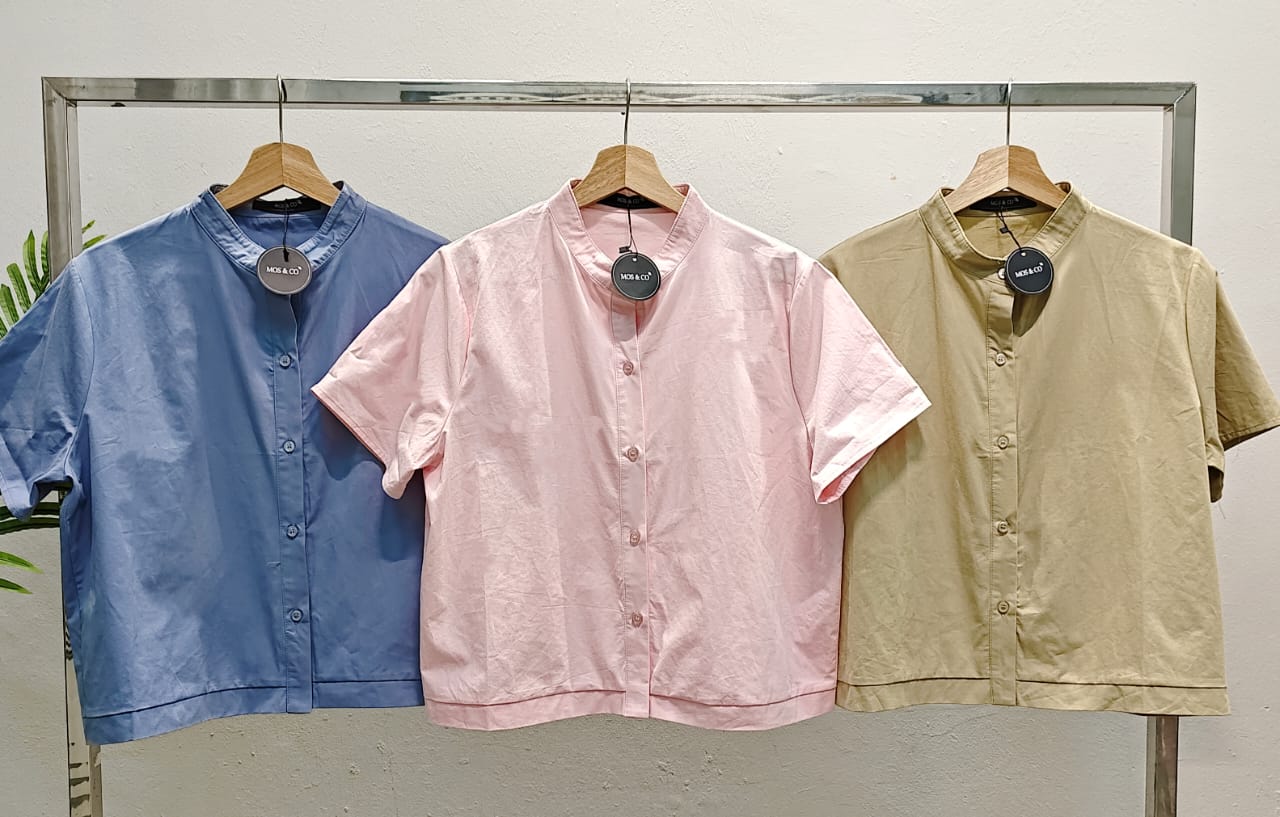 MBL-9664 FREE SIZE Summer new Korean high-end design short-sleeved round neck live row buckle slimming loose simple versatile shirt top women 夏季新款韩式高级设计感短袖圆领活排扣显瘦宽松简约百搭衬衫上衣女